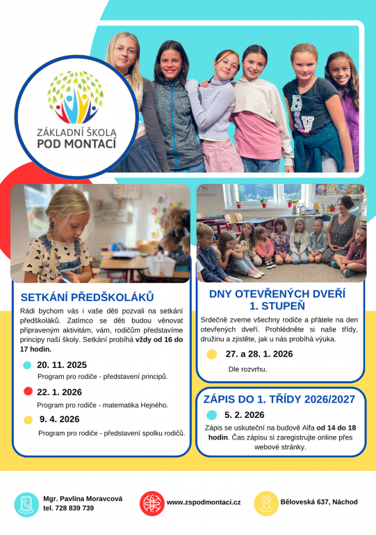 Přijďte se podívat do naší školy, seznámit se s učiteli a zjistit, co vaše budoucí prvňáčky čeká. Připravili jsme pro vás i děti zábavný program, a vy se dozvíte vše podstatné.